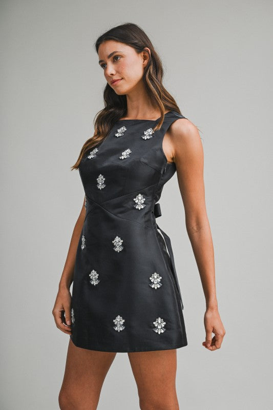 Jewel embellished detail sleeveless square neckline A line mini dress. Open V back with self tie.
