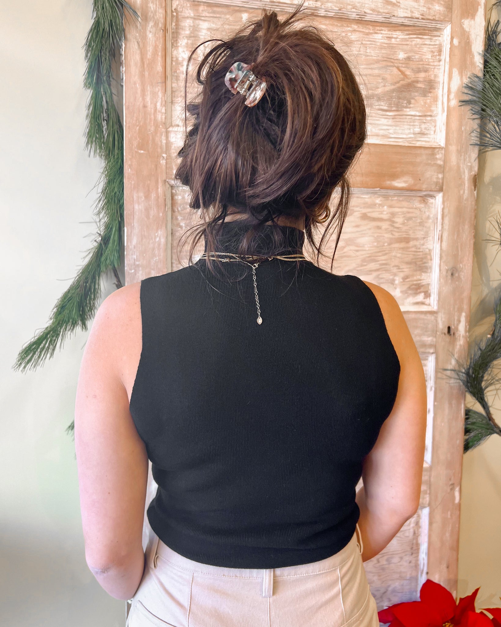 Knitted, turtleneck, tank top bodysuit with snap closure at the bottom.